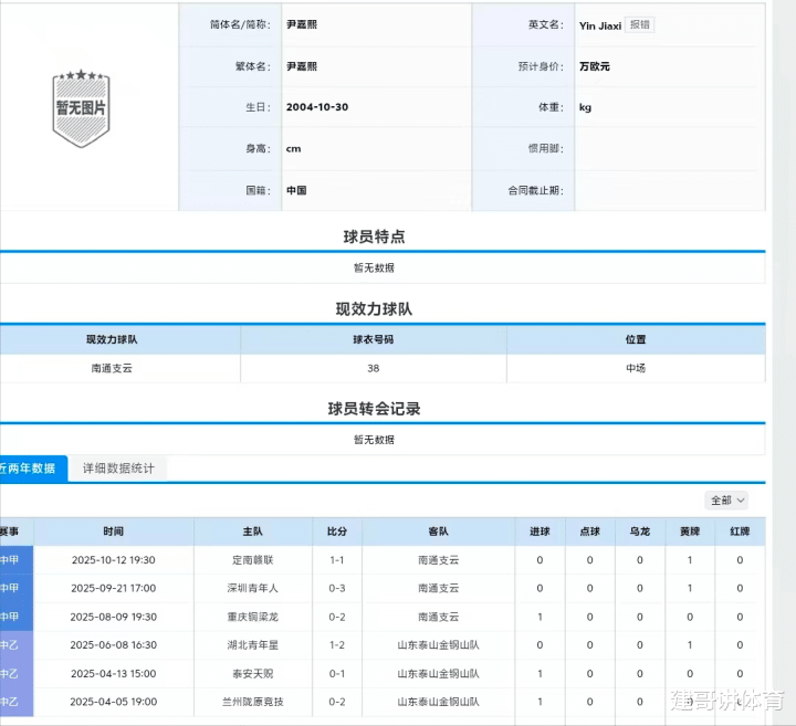 作为山东泰山B队的中场核心,尹嘉熙在山东泰山B队的时候,身穿65号球衣的他,也得到韩鹏的信任,作为山东泰山B队的中场组织者,在中乙赛场上尹嘉熙有过绝杀对手的壮举,同时还是山东泰山队参加亚冠联赛最年轻球员的他,在去年的夏窗得到了中甲球队南通支云的青睐,租借加盟南通支云后,尹嘉熙也收获了在中甲赛场上的进球,现在的尹嘉熙,只缺少中超联赛的进球了。